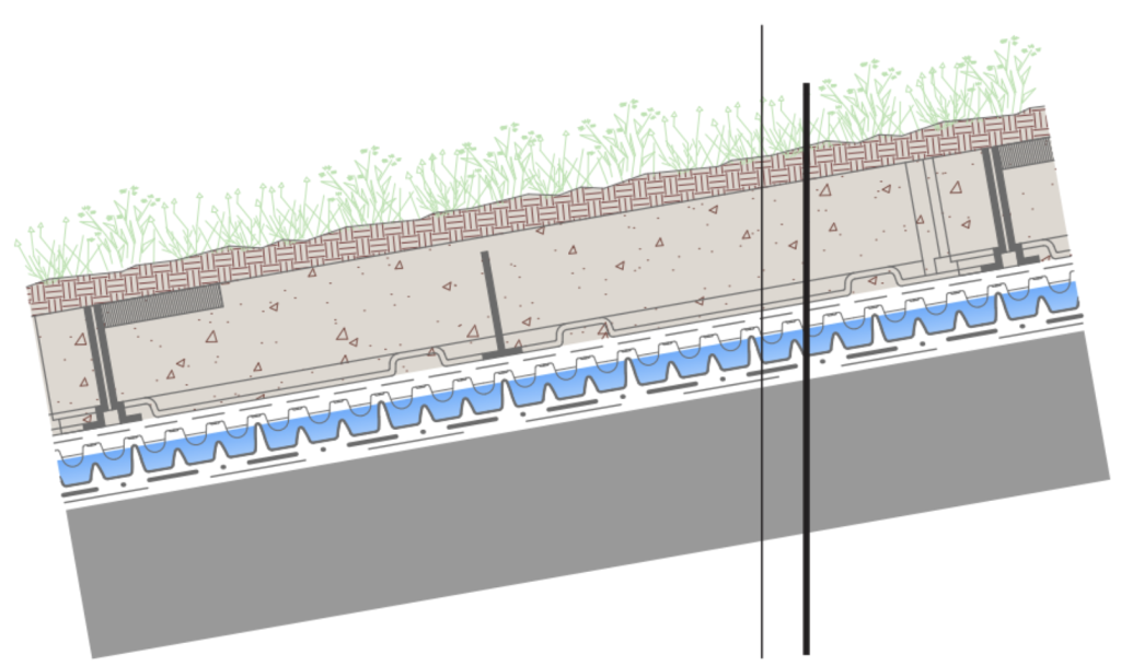 A DiaDomino-DP ferdetető rendszer cel- láiból kialakított raszter a 20-50°-os hajlás- szögű ferde zöldtetők erózió elleni védelmét szolgája. Támasztott szerkezet.